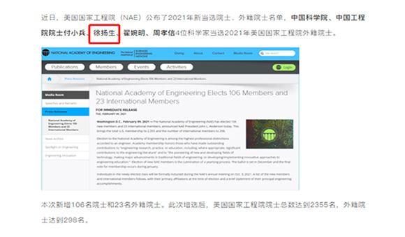 據(jù)悉:當(dāng)?shù)貢r間2月9日,美國國家工程院發(fā)布通知,(NAE)公布2021年新當(dāng)選院士、外籍院士名單,本次 新增106名院士和 23名外籍院士。此次增選后,美國國家工程院院士總數(shù)達(dá)到 2355名,外籍院士達(dá)到 298名。其中,中國科學(xué)院、中國工程院院士徐揚生入選!