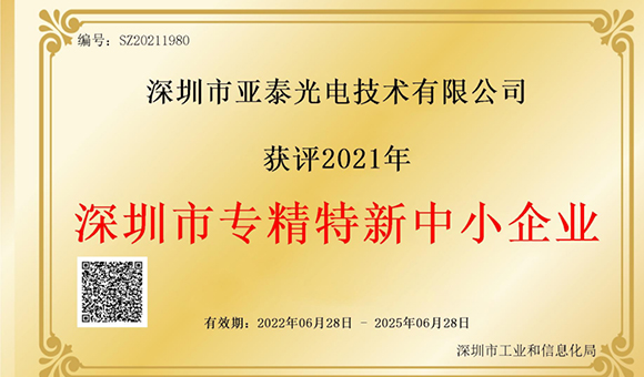 喜訊|深圳亞泰光電獲得深圳市“專(zhuān)精特新”企業(yè)榮譽(yù)稱(chēng)號(hào)!