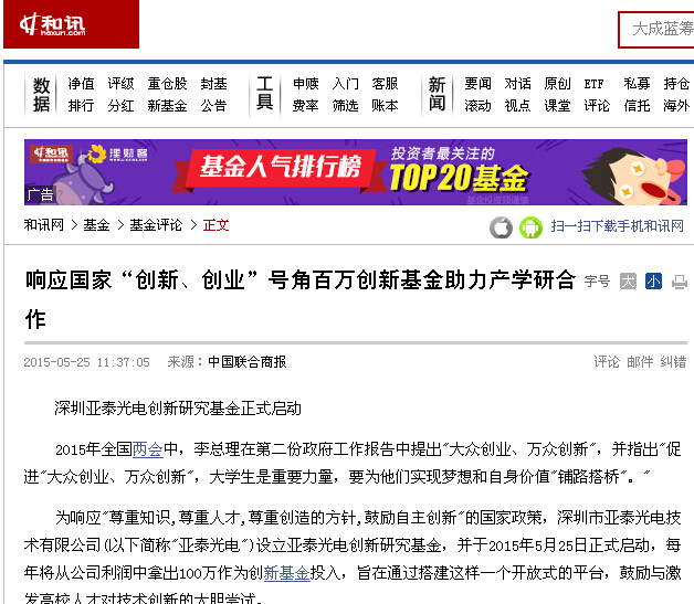 為響應"尊重知識,尊重人才,尊重創(chuàng)造的方針,鼓勵自主創(chuàng)新"的國家政策,深圳市亞泰光電技術(shù)有限公司(以下簡稱"亞泰光電")設(shè)立亞泰光電創(chuàng)新研究基金,并于2015年5月25日正式啟動,每年將從公司利潤中拿出100萬作為創(chuàng)新基金投入,旨在通過搭建這樣一個開放式的平臺,鼓勵與激發(fā)高校人才對技術(shù)創(chuàng)新的大膽嘗試。