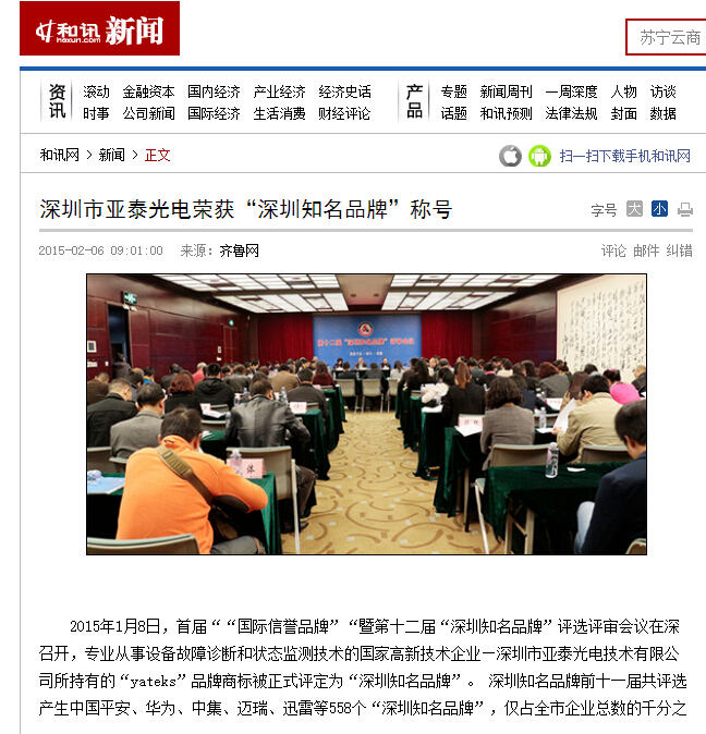 2015年1月8日,首屆““國際信譽品牌”“暨第十二屆“深圳知名品牌”評選評審會議在深召開,專業從事設備故障診斷和狀態監測技術的國家高新技術企業—深圳市亞泰光電技術有限公司所持有的“yateks”品牌商標被正式評定為“深圳知名品牌”。 深圳知名品牌前十一屆共評選產生中國平安、華為、中集、邁瑞、迅雷等558個“深圳知名品牌”,僅占全市企業總數的千分之一。