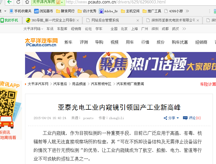 據深圳市亞泰光電技術有限公司李工透漏, SIE系列超清工業視頻內窺鏡目前已經在國內幾家知名的航空、電力公司試用,并受到了使用者的一致好評。在產品價格方面,李工表示該款產品研制的初衷就是與國外高端品牌競爭,所以價格方面會高于國內的大多數工業內窺鏡產品,但相比國外產品,價格優勢就非常的明顯,所以,整體來看是一款性價比非常高的產品。而且對于產品的質量,公司非常的重視,在老化試驗、跌落試驗等測試階段做了很多的工作,也非常的歡迎廣大用戶朋友提前預約試用。當然,自古“王婆賣瓜、自賣自夸”,我們的產品好不好,只要您用過就知道!