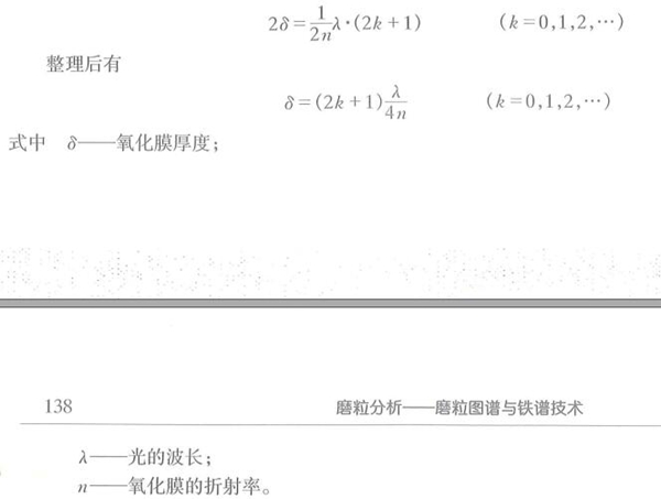 該式表明,當磨粒表面氧化膜的厚度恰恰等于某一單色光1/4波長的奇數倍時,其表面就呈現出該單色光的互補色,例如,當氧化膜的厚度是藍/紫色1/4波長即約0.038um時,磨粒表面呈草黃色,當氧化膜增厚是波長較長的紅/橙色光1/4波長即約0.055um時,磨粒表面呈黃色,不同材質金屬表面氧化膜生長速度是不一樣的,因此可以根據加熱后同一溫度下金屬材料的顏色(回火色)來判斷材料的合金屬類,這就是鐵譜片加熱分析法的原理。