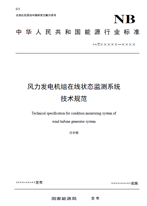 《風力發電機組在線狀態監測系統技術規范》規定了風力發電機組(以下簡稱“風電機組”)在線狀態監測系統的檢測單元、傳感器單元、數據采集及傳輸、數據存儲、數據顯示及軟件功能等方面的技術要求。從振動、轉速、油液顆粒三項檢測指標入手,對傳感器的配置、安裝、檢測指標和檢測要點等方面進行了多方論證與實驗,非常適用于并網型風力發電機組的傳動鏈部件等的運行狀態監測。