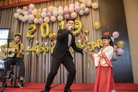 2019年亞泰光電企業年會得到了公司領導及管理層的大力支持,亞泰員工自編自導共有10余個節目參與演出,形式多種多樣,既有《亞泰光電之歌》詩詞朗誦、吉他彈唱,又有魅力四射的現代舞蹈,特別是穿插的幸運抽獎環節更是將活動現場一次次推向高潮,整個宴會大廳沉浸在一片歡樂的海洋之中。