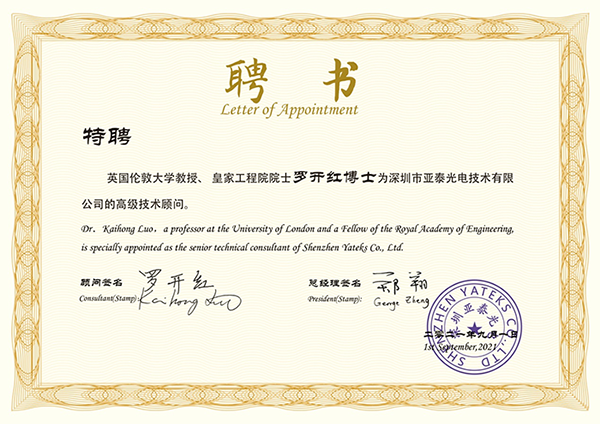 風勁帆滿海天闊,牽手闊步新征程!2021年9月1日,深圳市亞泰光電技術有限公司特聘英國倫敦大學教授、皇家工程院院士羅開紅博士為高級技術顧問。亞泰光電總經理鄭翔為羅開紅博士頒發了聘書。