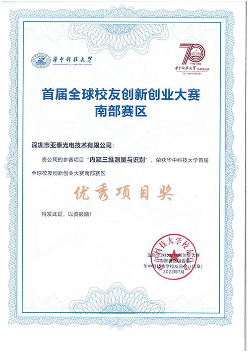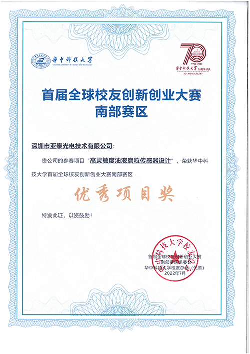 2022年6月26日,華中科技大學全球校友首屆創(chuàng)新創(chuàng)業(yè)大賽南部賽區(qū)決賽在深圳圓滿收官。深圳市亞泰光電技術(shù)有限公司在此次比賽中,“高靈敏度油液磨粒傳感器設(shè)計”和“內(nèi)窺三維測量與識別”兩個項目榮獲“優(yōu)秀項目獎”。