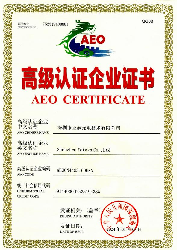 日前,經海關總署審批,亞泰光電獲得深圳海關頒發(fā)的“AEO高級認證企業(yè)證書”,在全球貿易道路上又進一步。亞泰光電此次通過海關最高信用等級認證,獲得了全球貿易的“綠色通行證”,對企業(yè)的國際貿易有著重要意義。