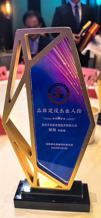 7:00 PM,國(guó)際品牌周之2024品牌領(lǐng)袖之夜在深圳廣電金融中心舉行,亞泰光電總經(jīng)理鄭翔獲評(píng)“品牌建設(shè)杰出人物”獎(jiǎng)項(xiàng)。