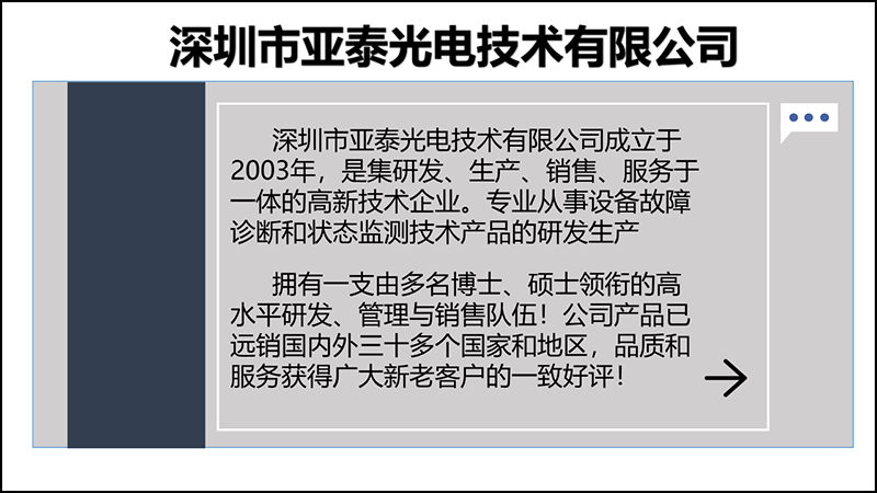 亞泰光電,國家高新技術(shù)企業(yè)和深圳知名品牌,10余年工業(yè)內(nèi)窺鏡和油品分析儀研發(fā)、生產(chǎn)行業(yè)經(jīng)驗(yàn),國內(nèi)外知名企業(yè)合作供應(yīng)商,產(chǎn)品優(yōu)惠熱線:13316911816(微信同號(hào)) 0755-86656096 0755-86656390 聯(lián)系我們獲取更多優(yōu)惠詳情,期待您的指導(dǎo)與交流!