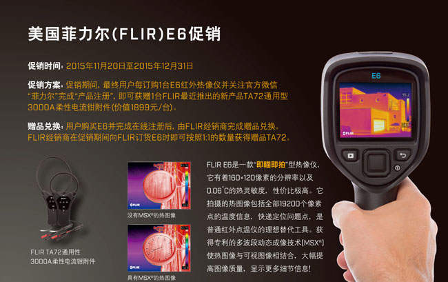 促銷期間,最終用戶每訂購1臺E6紅外熱像儀并關注官方微信“菲力爾”完成“產品注冊”,即可獲贈1臺FLIR最近推出的新產品TA72通用型3000A柔性電流鉗附件(價值1899元/臺)。